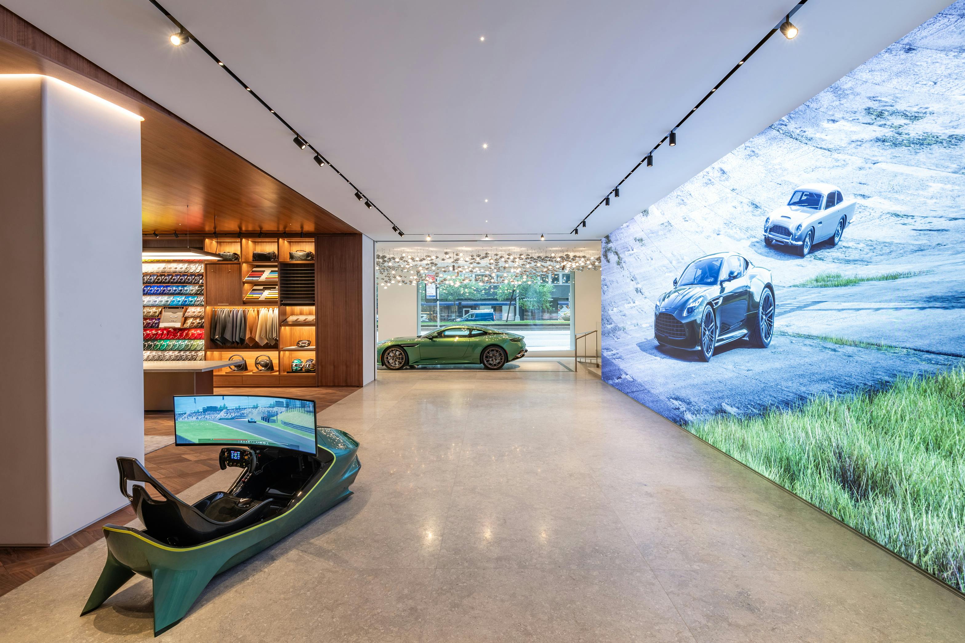 A 40-foot ultra-HD display lets customers view car configurations instantaneously. This adaptable showroom features a flexible track system for spotlights, linear lights, and pendants.