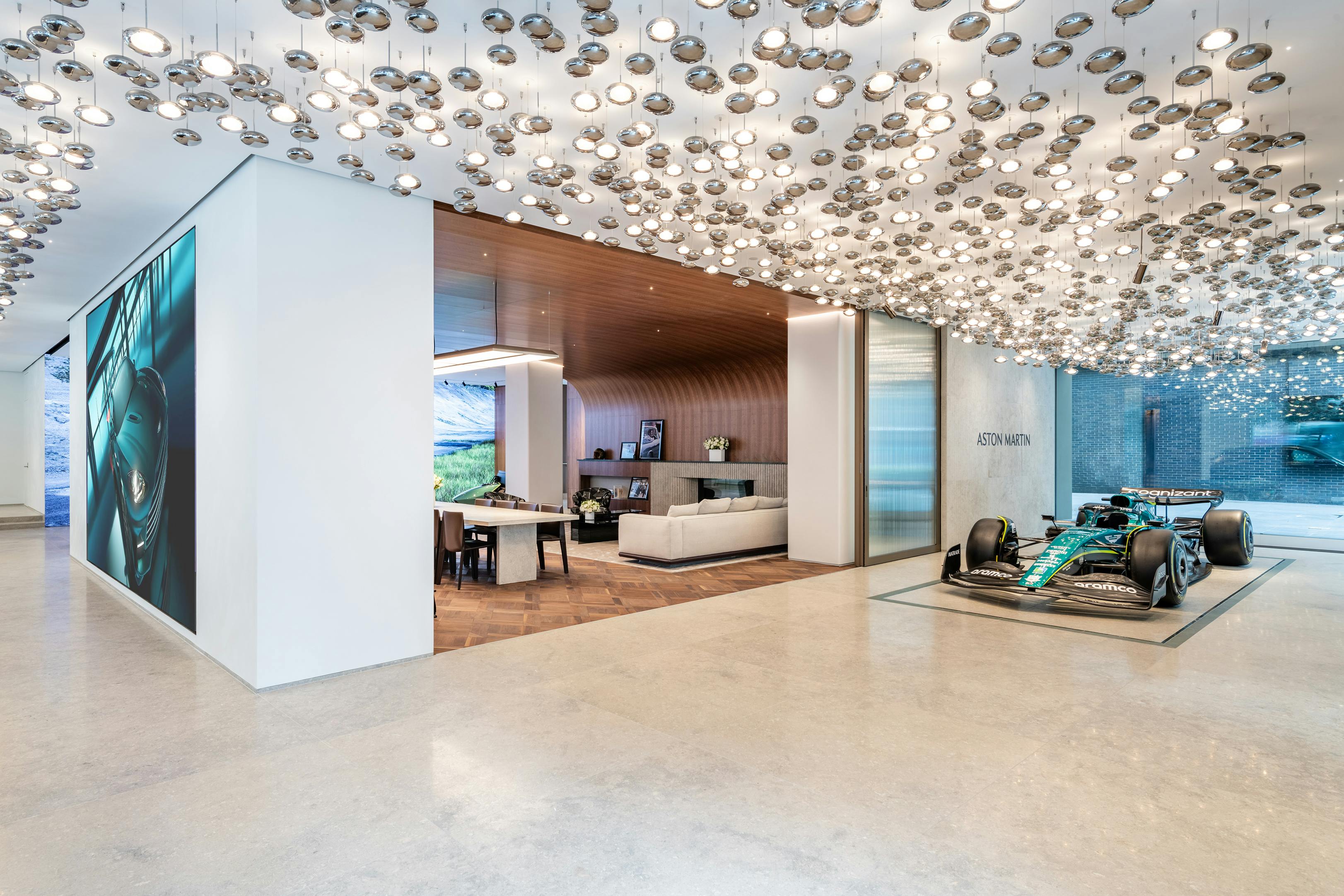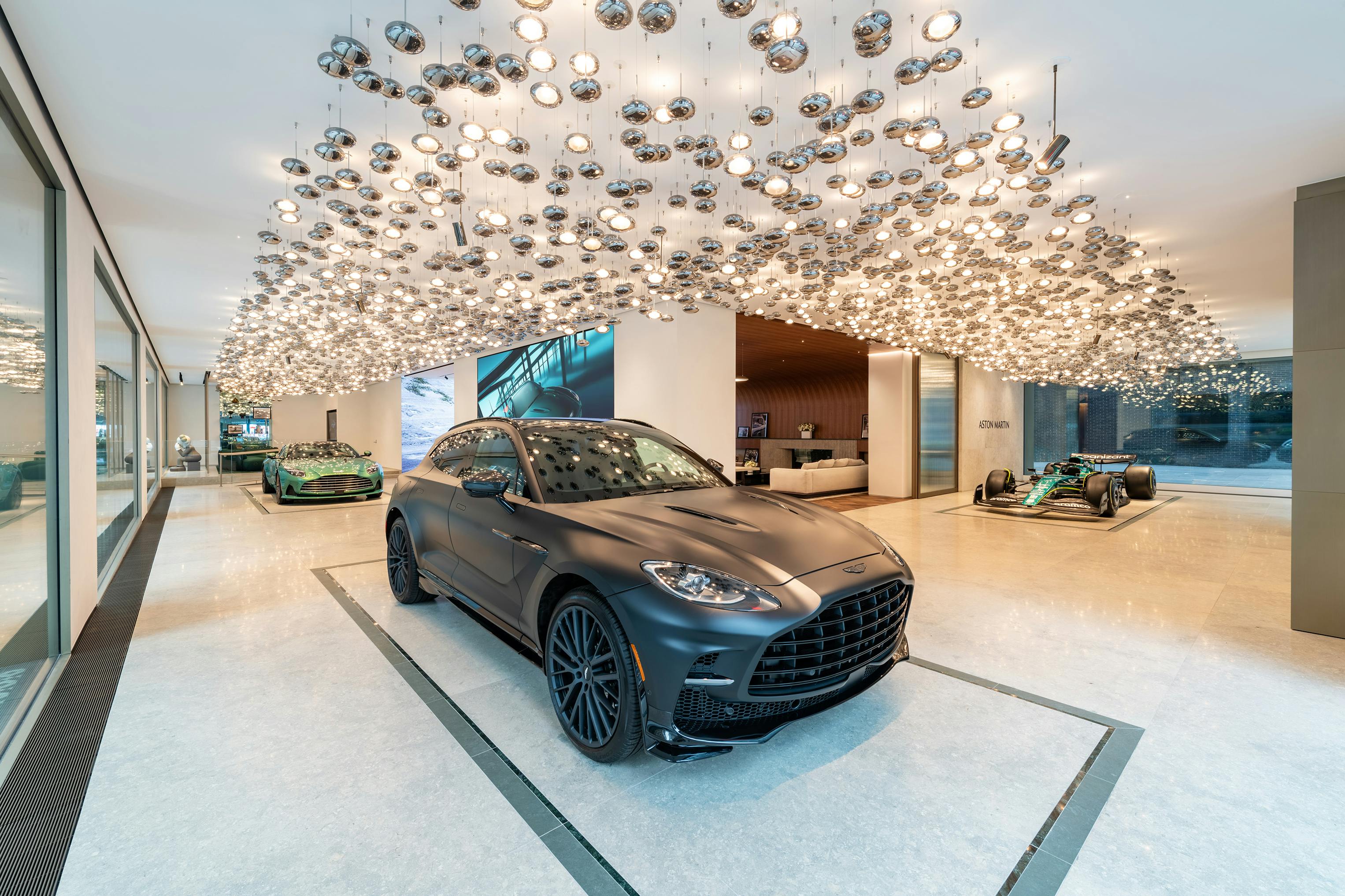 At the corner of Park Avenue and 57th Street, a constellation of 3,000 suspended glass globes spanning 131 feet beckons visitors into the Aston Martin showroom, which also serves as a vehicle customization center. A vast arrangement of suspended glowing orbs illuminate and reflect off the cars displayed on the marble floor, setting the stage for an immersive encounter. The adjacent experiential center offers a visual blend of physical and digital car configurations. Throughout, the lighting is thoughtfully composed to elevate the experience as the space transforms between a showroom, lounge, and events venue.