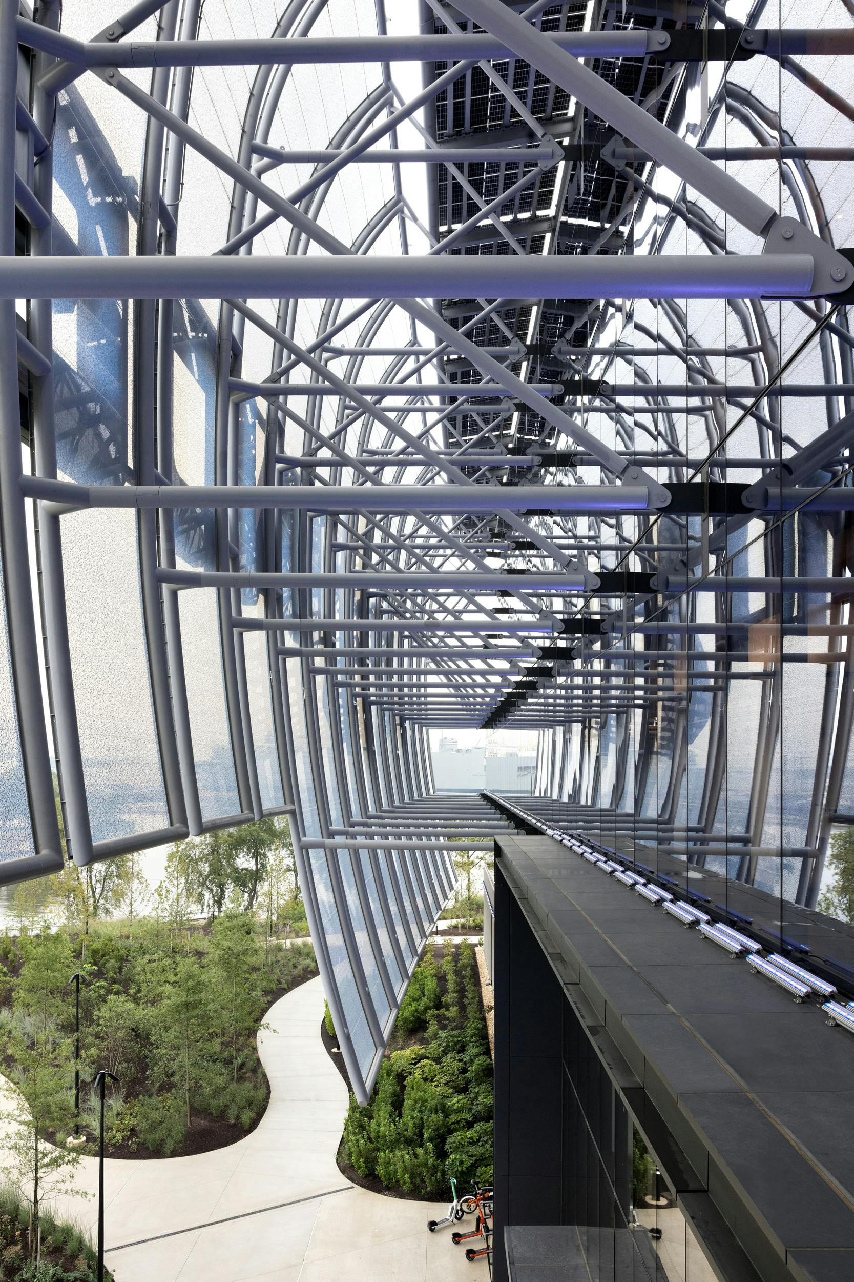 The striking 21,000sf stretched tensile ETFE façade became a powerful canvas for brand expression and acts as a beacon for visitors. At night, multiple rows of discreetly mounted, color-changing linear floodlights gently wash the membranes, creating a soft, uniform glow. The installation allows the façade to come alive at night, and is programmed to respond to special events, emphasizing connection with the local community.